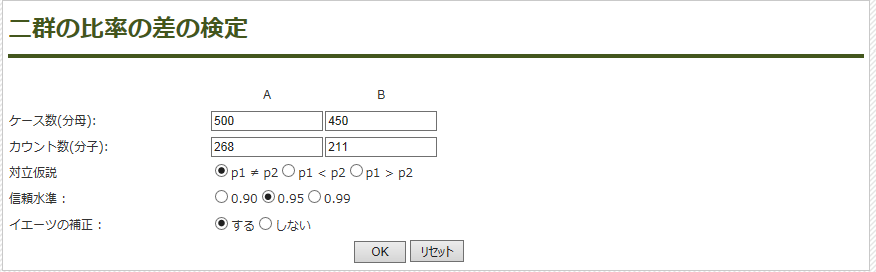 ある政党の支持率について調査しました。男性の有権者 500 人中 268 人,女性の有権者 450 人中 211 人が支持していました。